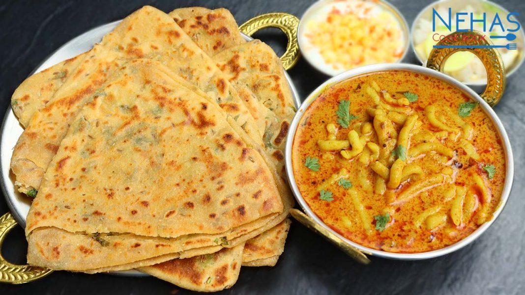 Gathiya nu shaak with layered paratha | kathiyawadi gathiya nu shaak | jeera kothmir layered paratha