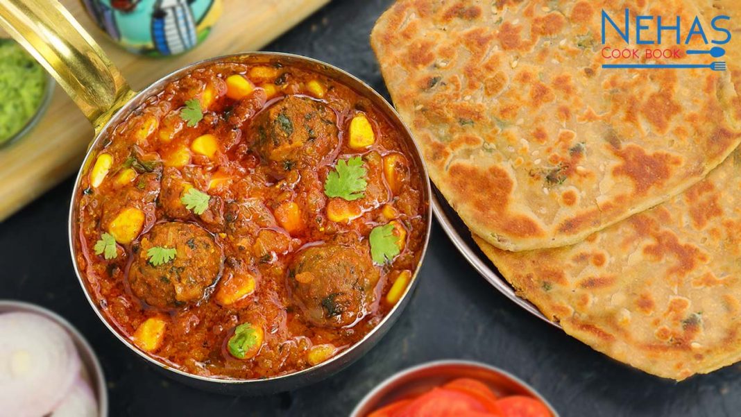 Muthiya makai nu shak and paratha is easy to make kathiyawadi combo with all the basic ingredients from your kitchen. The sabzi is made with corn and methi (frenugeek) muthiya cooked in tomato-onion gravy. This spicy and tasty sabzi with cumin (jeera) flavor wheat paratha is love by all kinds of age groups. This winter season does make this dhaba style combo and enjoy its mouth-watering taste along with friends and family!