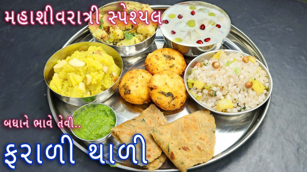 A bouquet of farali dishes assembled and served in a traditional thali. It is a complete farali meal during shivratri, fasting, or other upvas or vrat days like janmashtami or navratri. Try this quick and easy thali recipe with all the basic ingredients from your kitchen.