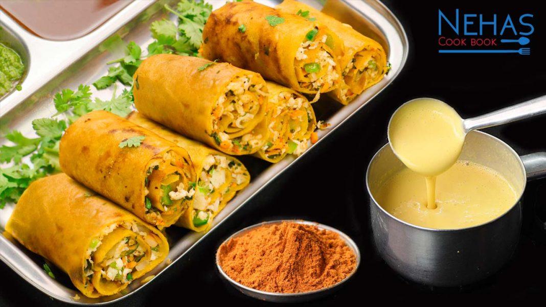 • Once the pudla get cooked, remove it and transfer it onto a chopping board or a plate and cut it into thick strips and roll it.