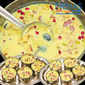 At the time of serving, add ¼ cup chopped apple, ¼ cup chopped black grapes, ¼ cup chopped green grapes, ¼ cup chikoo pieces, ¼ cup banana pieces, and ¼ cup pomegranate seeds. Mix well.