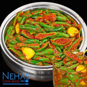 Wash and completely dry 300 grams of green chillies. Remove the stalks and cut each chilli into two pieces. Do not remove the seeds or veins, as they help maintain the firmness of the chillies. Use small-sized green chillies; if the chillies are slightly large or long, cut them into smaller pieces.